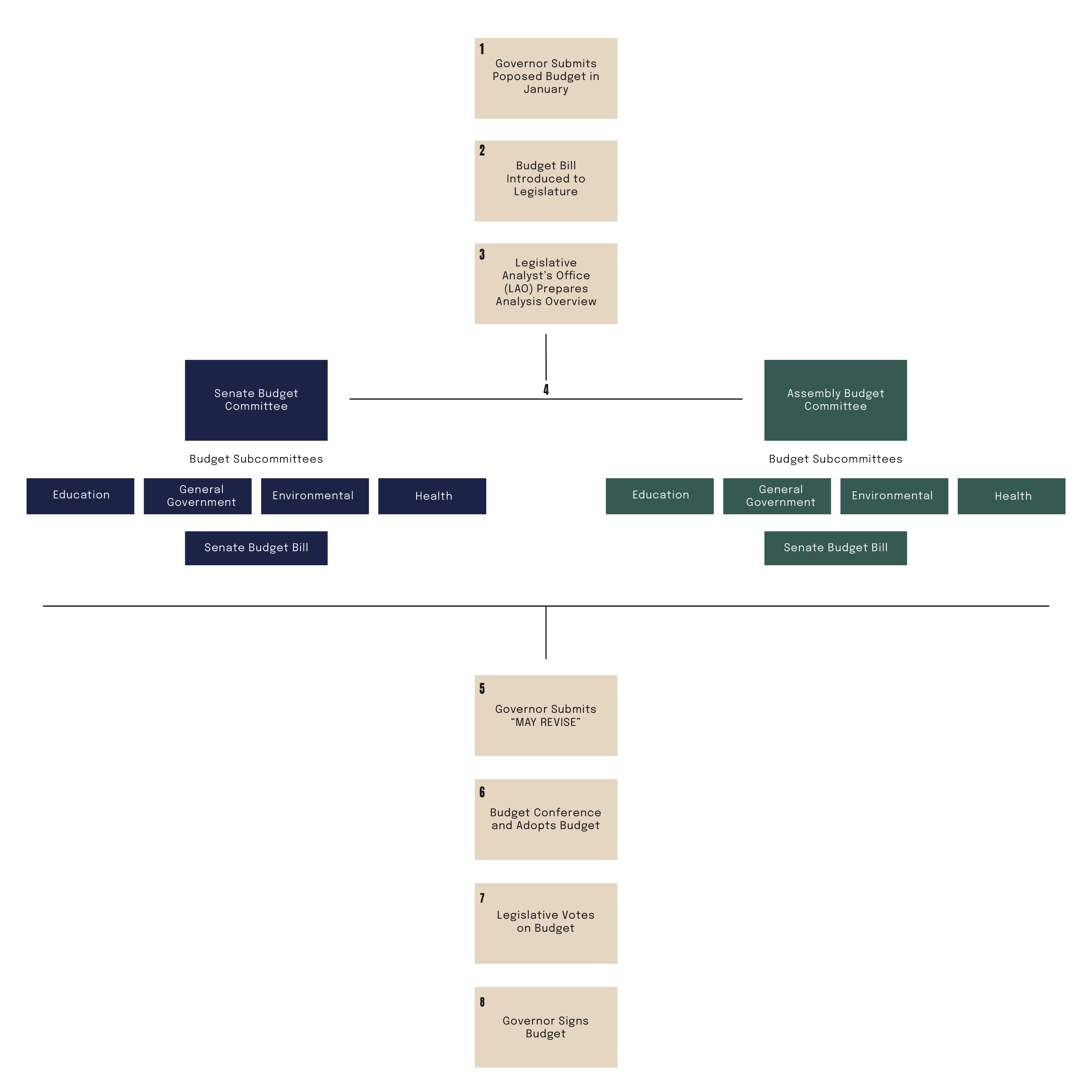 In May, the Governor releases updated revenue estimates and a revised proposal. The Legislature must pass a balanced budget by June 15, and the Governor signs it into law — with the power to veto individual spending items.